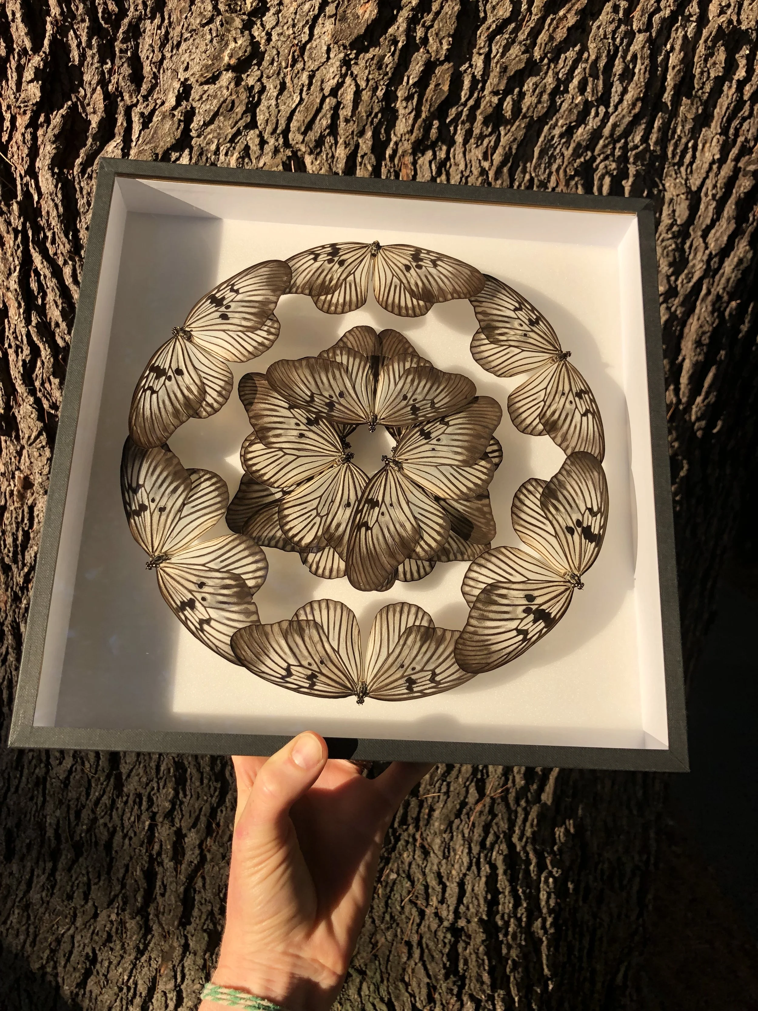 I spread and layer my experiences through natural specimens arranged in sculptural shadow boxes. Using the remains of creatures that walk, crawl, flutter, and fly within the atmosphere of Earth, I share the enduring magic of life. Deep, Dark, Bright reflects the resilience of the human spirit during its darkest hours and the profound responsibility we hold—to each other and to the natural world.